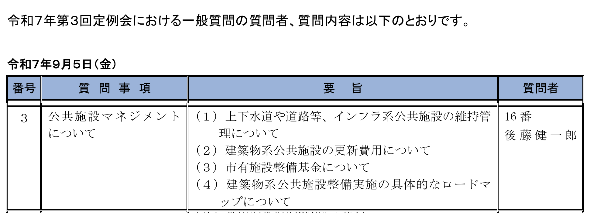 今回私は、公共施設マネジメント、とりわけ、全国的にも今年大きくニュース報道された「インフラ系公共施設(上下水道や道路など)の安全について」、そして直近で統合病院および統合中学校、そしてその後も建て替えや維持管理がたくさん見えている「建築物系公共施設の今後の進め方について」の、大きくまとめるとその2点で一般質問を行います。