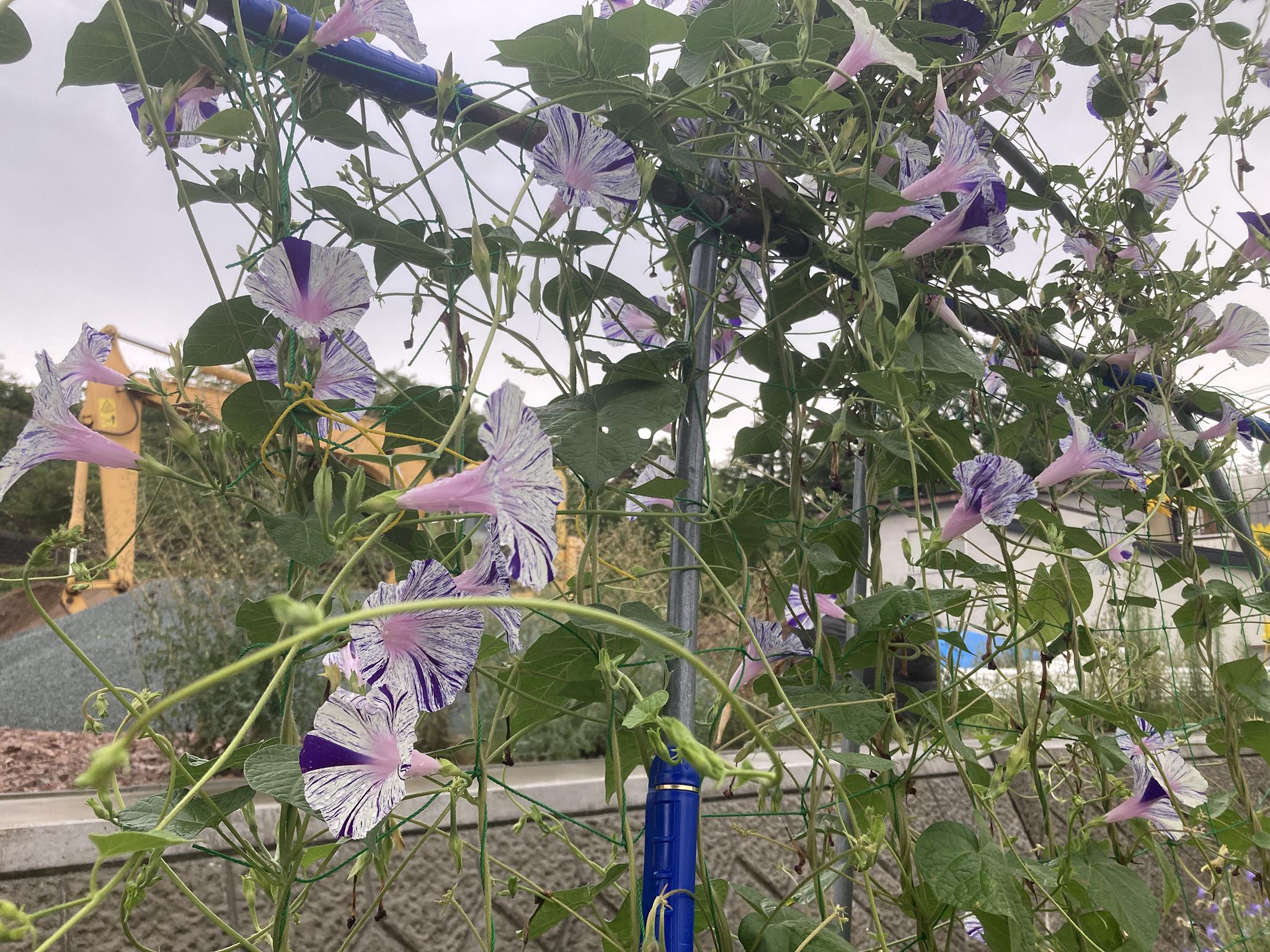 先月までは、私が出社する時にははもうぐったりして花を閉じていた朝顔。