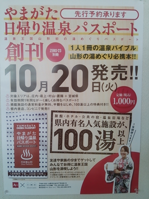 今回お手伝いさせて頂いた、やまがた日帰り温泉パスポートが10月20日に発行されます。
